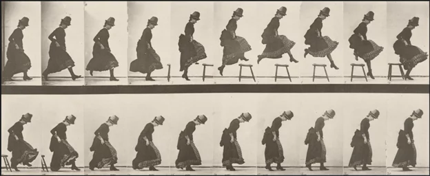 Mit einer Reihe von Kameras, die mit elektrischen Verschlüssen ausgestattet waren, löste Muybridge einen Streit, den das menschliche Auge nicht lösen konnte. Seine Pferdefotografien demonstrierten das künstlerische, wissenschaftliche und industrielle Potenzial des Mediums Fotografie. Nebst der Erfassung von Tieren beschäftigten ihn auch Bewegungsabläufe von Menschen. So entstanden diverse Fotoreihen mit Abfolgen von Bewegungen, unter anderem die oben gezeigte Serie einer Dame.