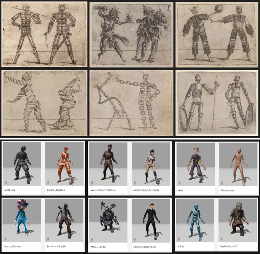 Mixamo ist so eine Datenbank. Wenn ihr auf www.mixamo.com geht, könnt ihr diverse Figuren ansehen und auch herunterladen als Datei. Was es in dieser Datenbank auch hat, sind Bewegungen. Auch diese können angeschaut werden – mit einem der ausgewählten 3D-Körper – und dann heruntergeladen werden. Wenn ihr euch auskennt in einem Programm, das animieren kann (z.B. Unity oder Unreal), könnt ihr diese Bewegungen als kleine Pakete in die Software importieren und damit eure selber kreierte Figur animieren.
